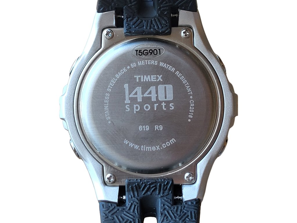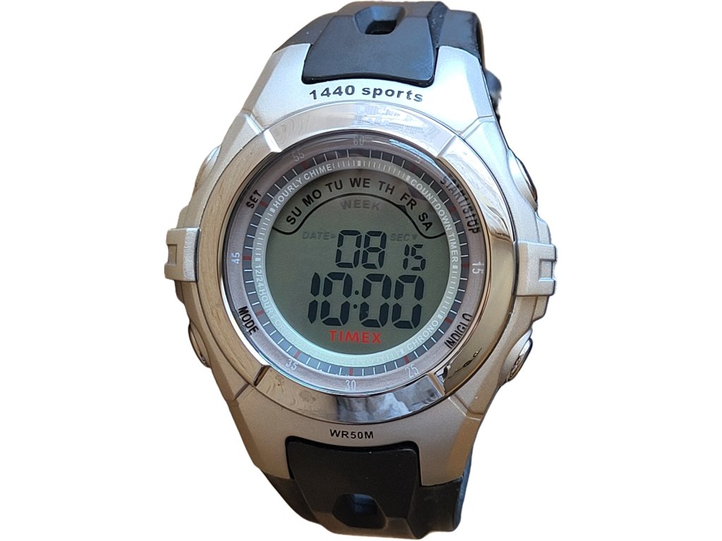 Sportovní hodinky s chronografem, odpočítávačem a budíkem. Podsvícení Indiglo, Voděodolnost 50 m, datum se zobrazuje jako den v měsíci a název dne v týdnu