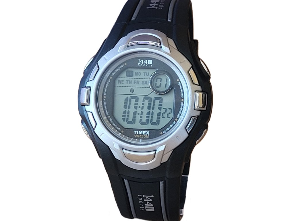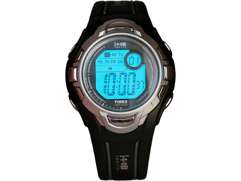 Sportovní hodinky s chronografem, odpočítávačem a budíkem. Podsvícení Indiglo, Voděodolnost 50 m, datum se zobrazuje jako den v měsíci a název dne v týdnu