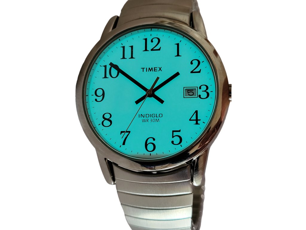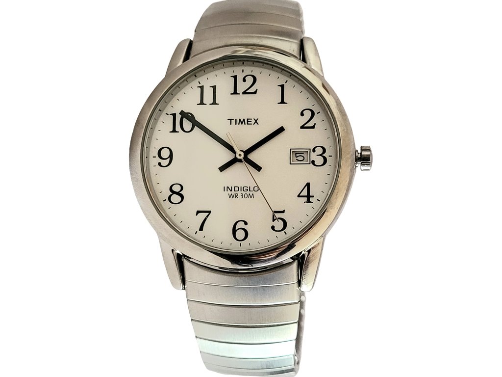 Klasické hodinky s vteřinovou ručičkou, zobrazují aktuální den v měsíci, voděodolnost 30 m, podsvícení Indiglo. Řemínek má v nenataženém stavu 18 cm.