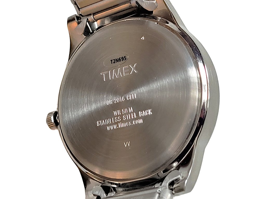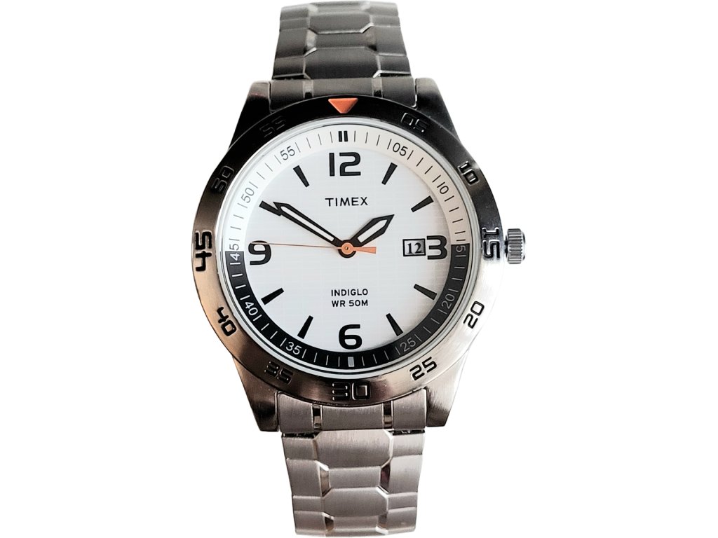 Timex T2N695W jsou sportovně-elegantní hodinky s kovovým pouzdrem a ocelový tahem. Dominantou ciferníku je jeho dvoubarevné lemování a pevná luneta. Hodinky mají velké konstrastní číslice vůči bílému podkladu. Čitelnost zaručují luminiscenční ručičky a podsvícení Indiglo. Voděodolnost do 50m.