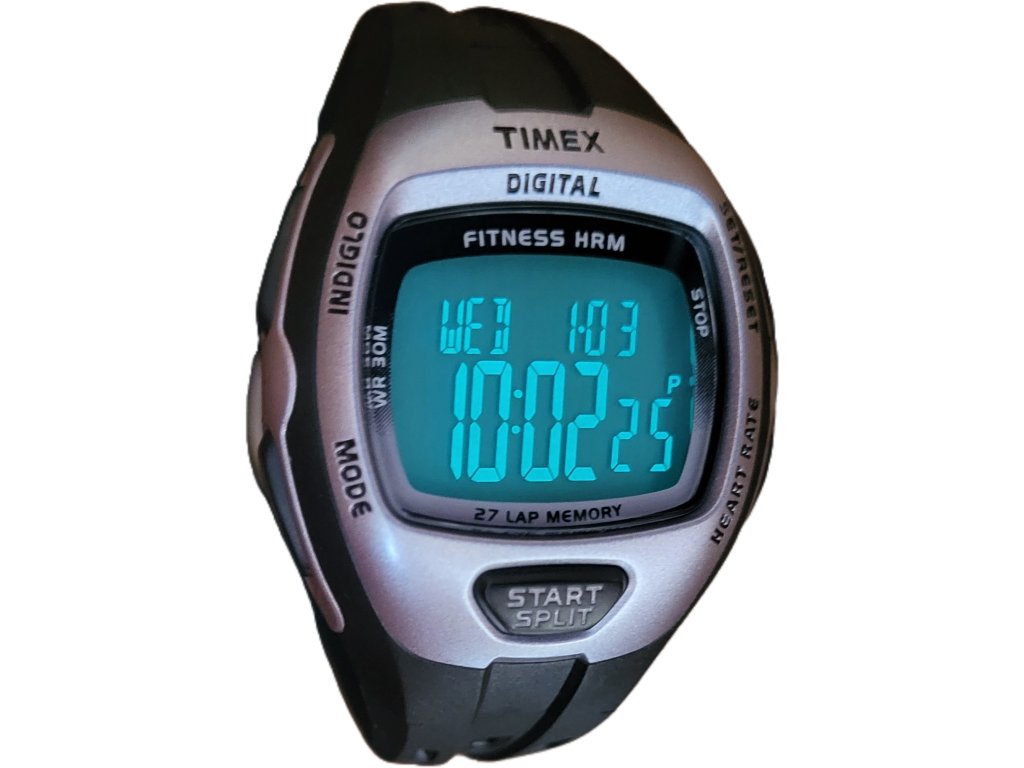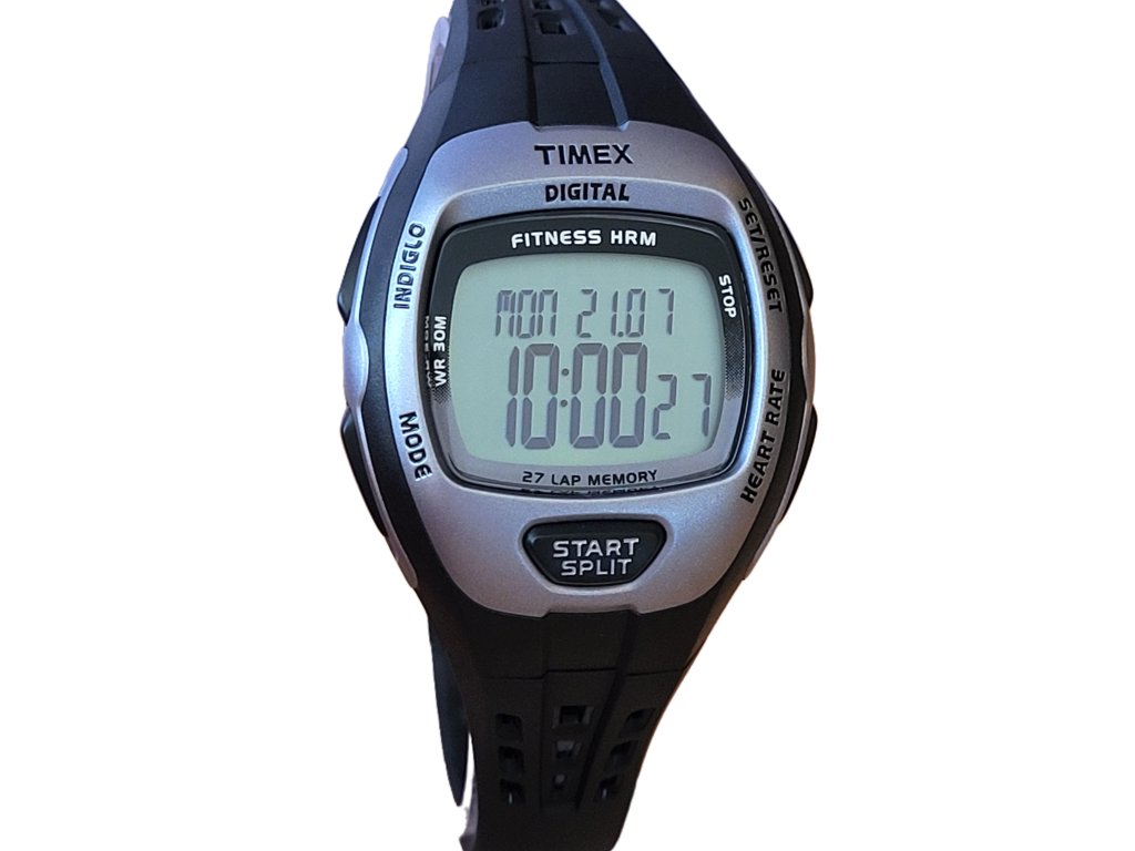 Sportovní hodinky s chronografem a uložením 27 kol, fitness hodinky s monitorem srdečního tepu, možnost nastavení vlastních zón, voděodolnost 30 m, 100 hodinový odpočítávač, osvětlení Indiglo, budík