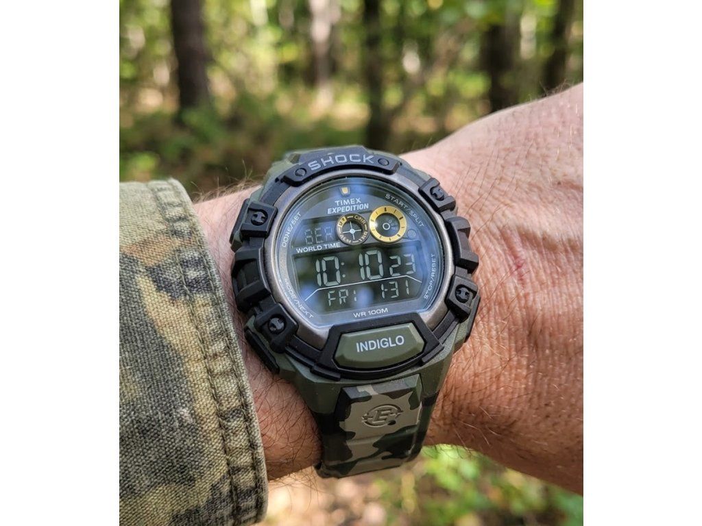 Digitální hodinky Timex Expedition Shock T49971 nabízí voděodolnost 100 m, podsvícení INDIGLO, odpočítávač, stopky i 3 budíky. Odolný parták pro výšlap terénem i jiné sportovní aktivity. Přehledný displej umožní vidět to nejdůležitější jedním pohledem. Objevte je u nás!
