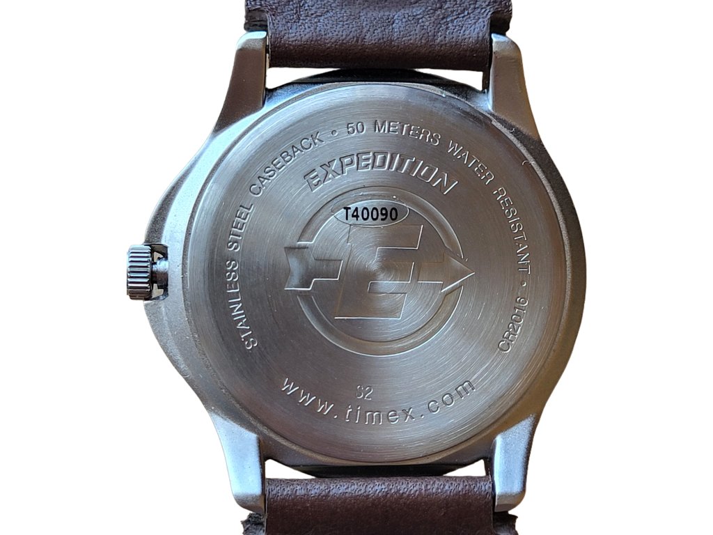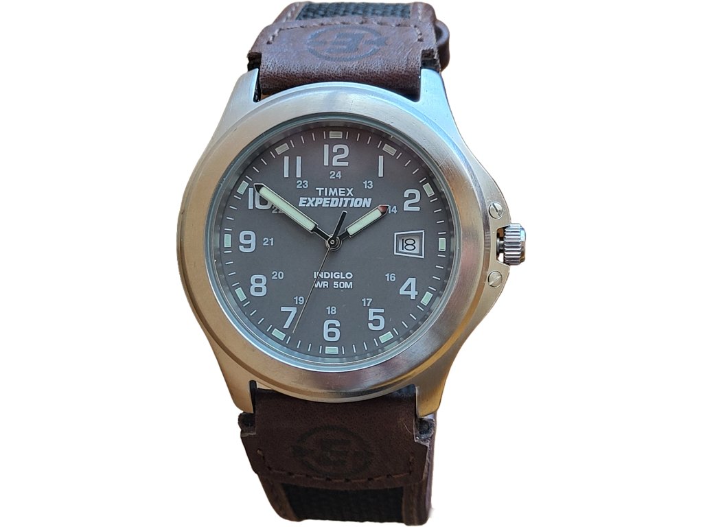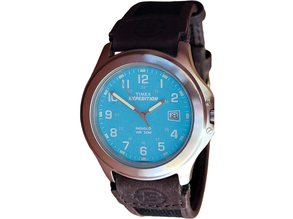 Outdoorové hodinky s podsvícením Indiglo. Zobrazují aktuální den v měsíci, luminiscenční ručičky. Voděodolnost 50 m.