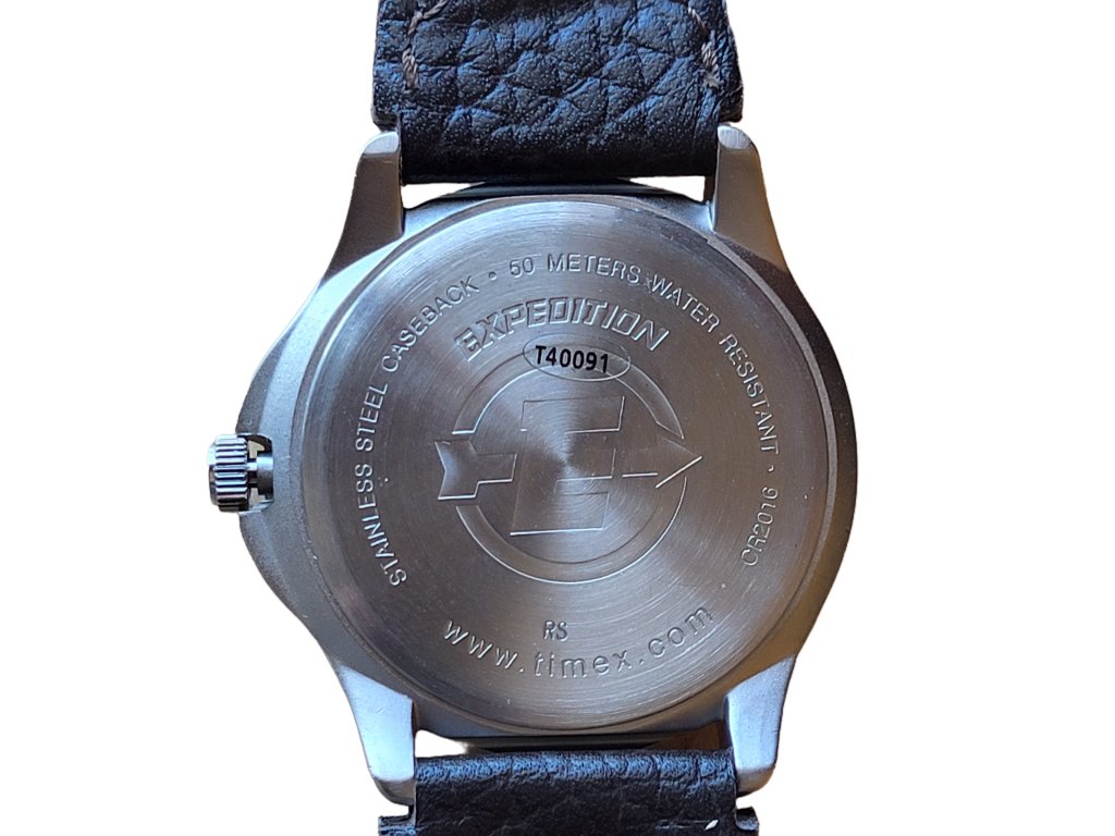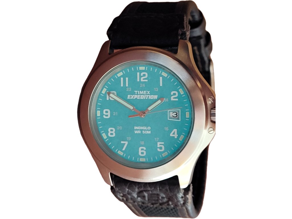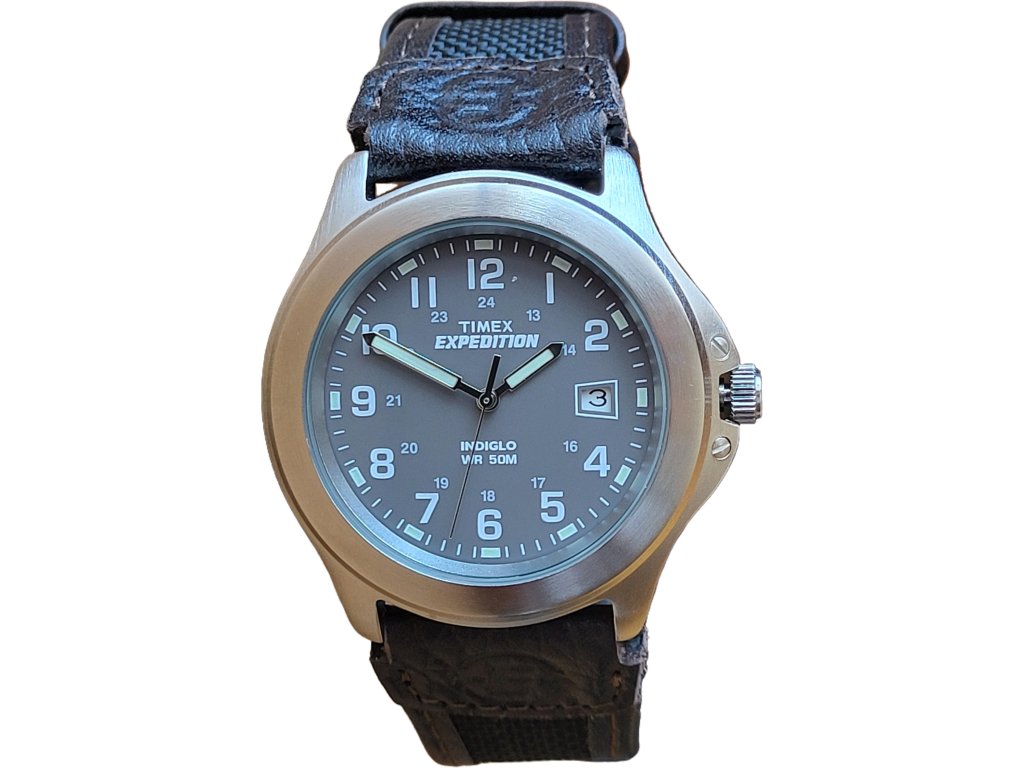Outdoorové hodinky s podsvícením Indiglo. Zobrazují aktuální den v měsíci, luminiscenční ručičky. Voděodolnost 50 m.