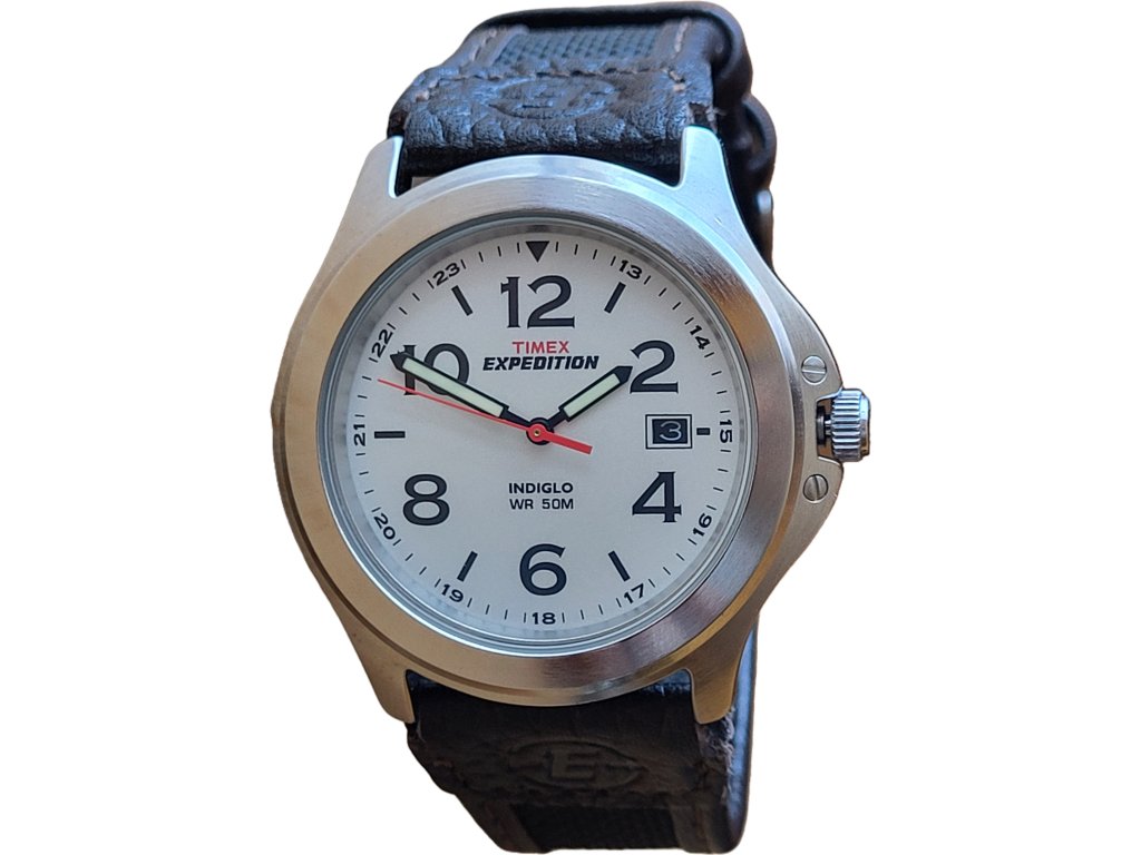 Outdoorové hodinky s podsvícením Indiglo. Zobrazují aktuální den v měsíci, luminiscenční ručičky. Voděodolnost 50 m.