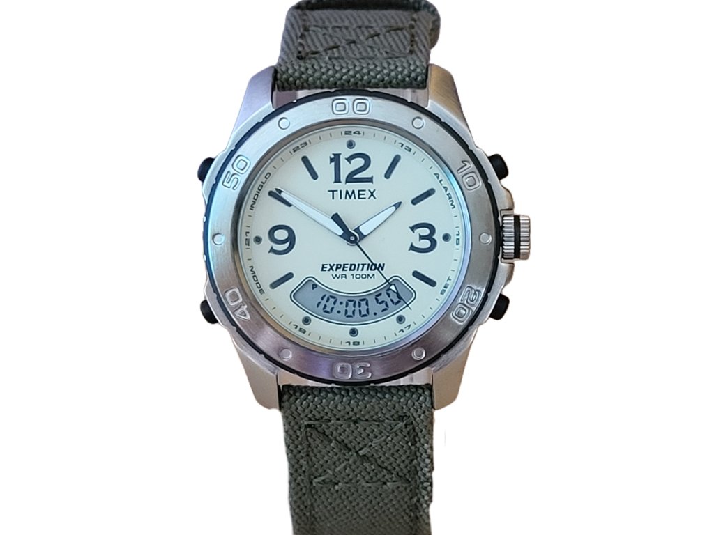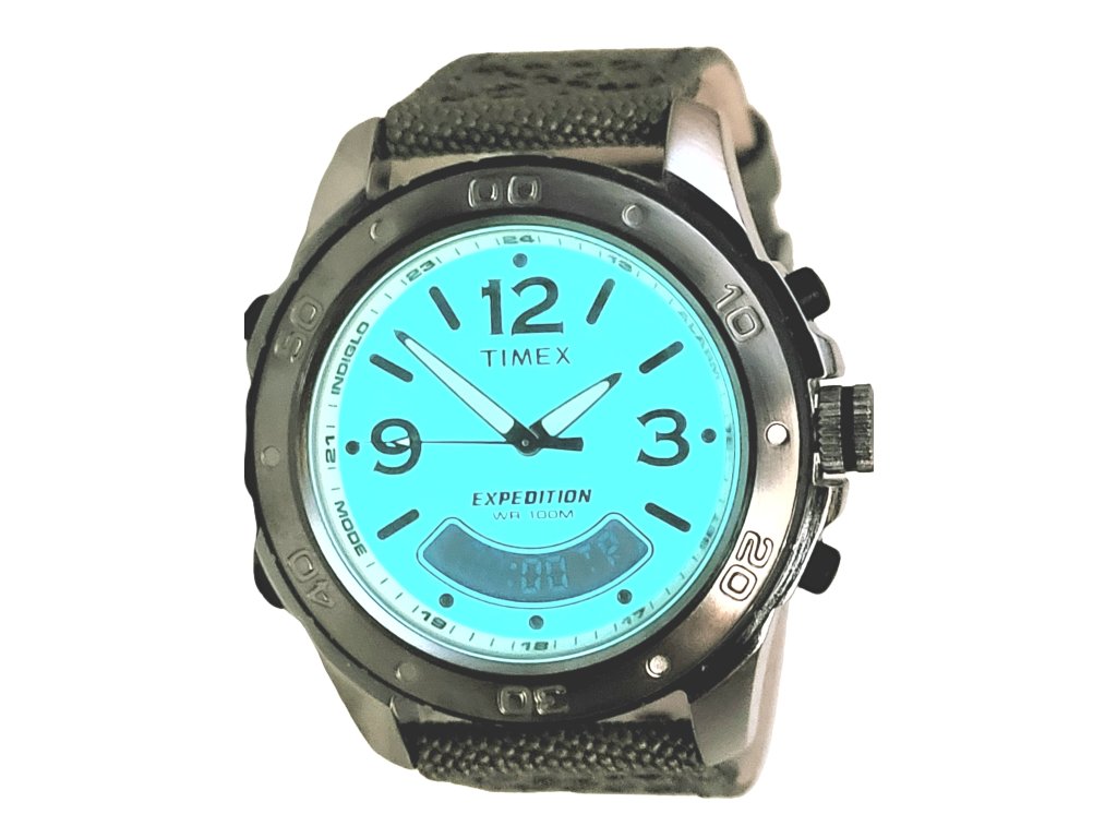 Outdoorové hodinky s chronografem, kombinace digitálního a analogového zobrazení času, lze nastavit budík, datum zobrazeno jako měsíc a den, pevná luneta, vodotěsnost 100 m, podsvícení Indiglo, luminiscenční ručičky, noční režim