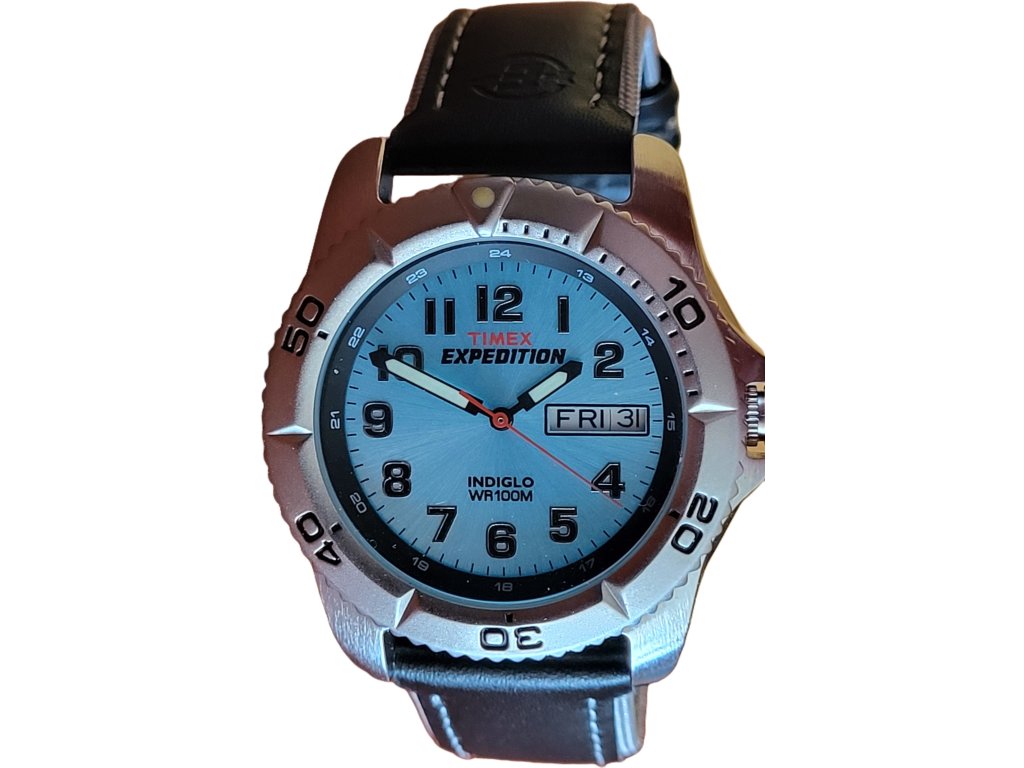 Outdoorové hodinky s podsvícením Indiglo, jednosměrně otočná luneta, zobrazují aktuální den v měsíci. Vodotěsnost 100 m, luminiscenční ručičky