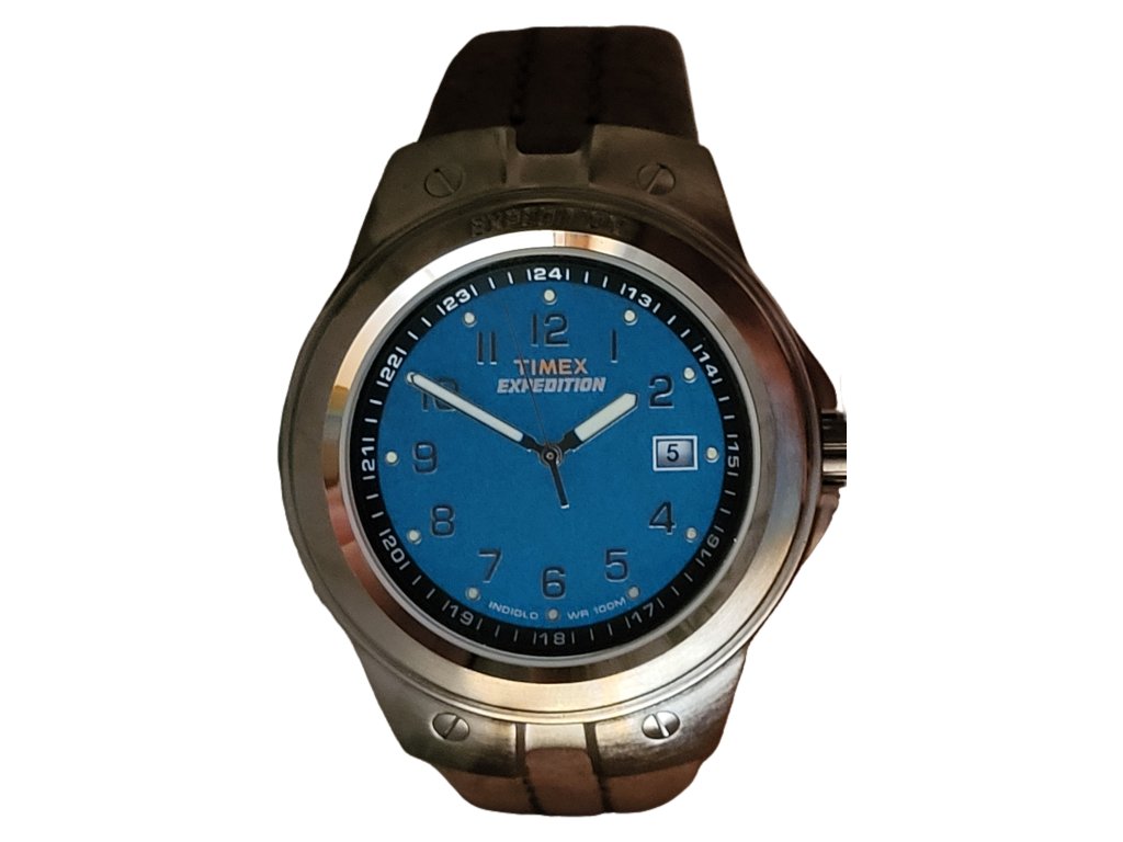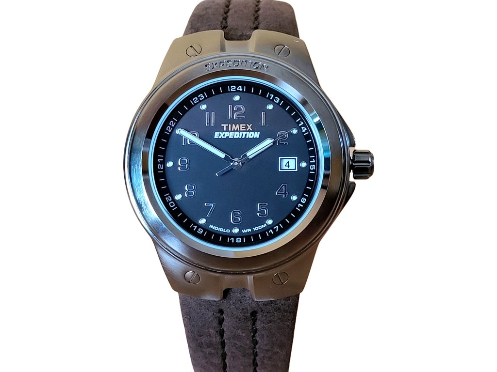 Outdoorové hodinky s podsvícením Indiglo. Zobrazují aktuální den v měsíci, luminiscenční ručičky. Voděodolnost 100 m.