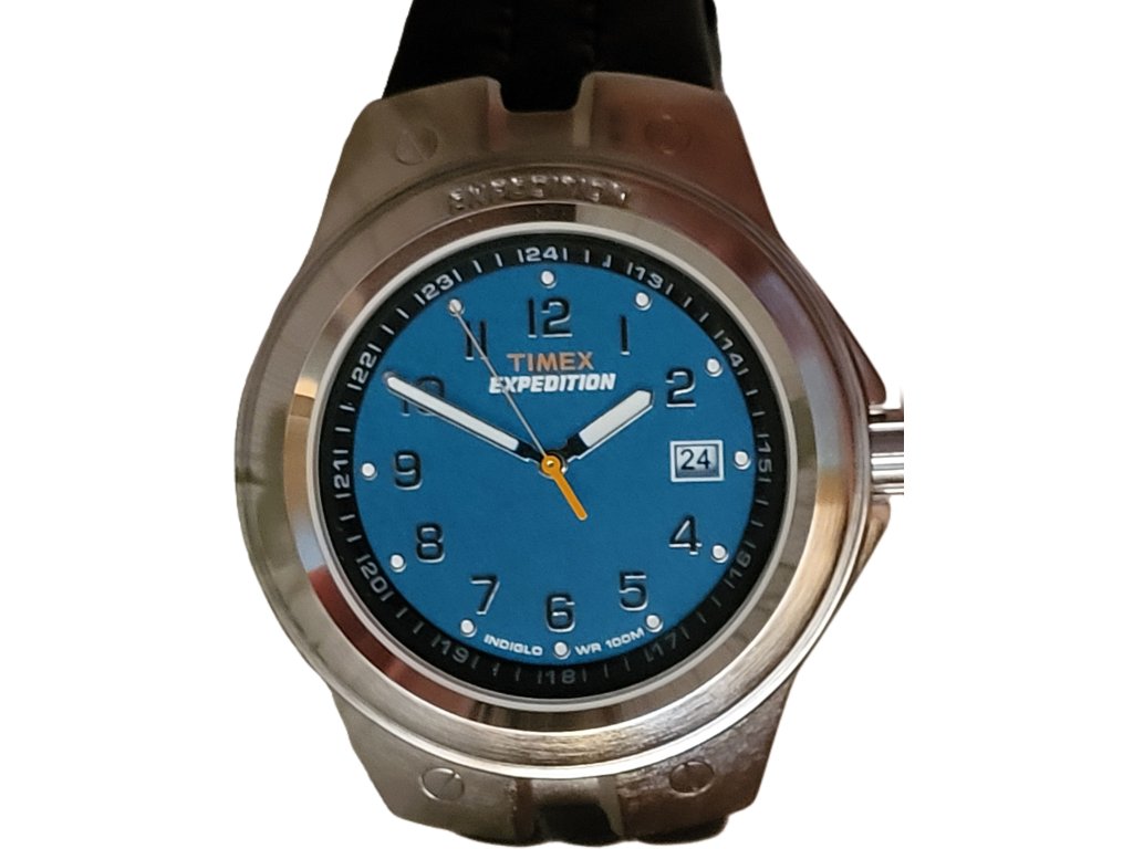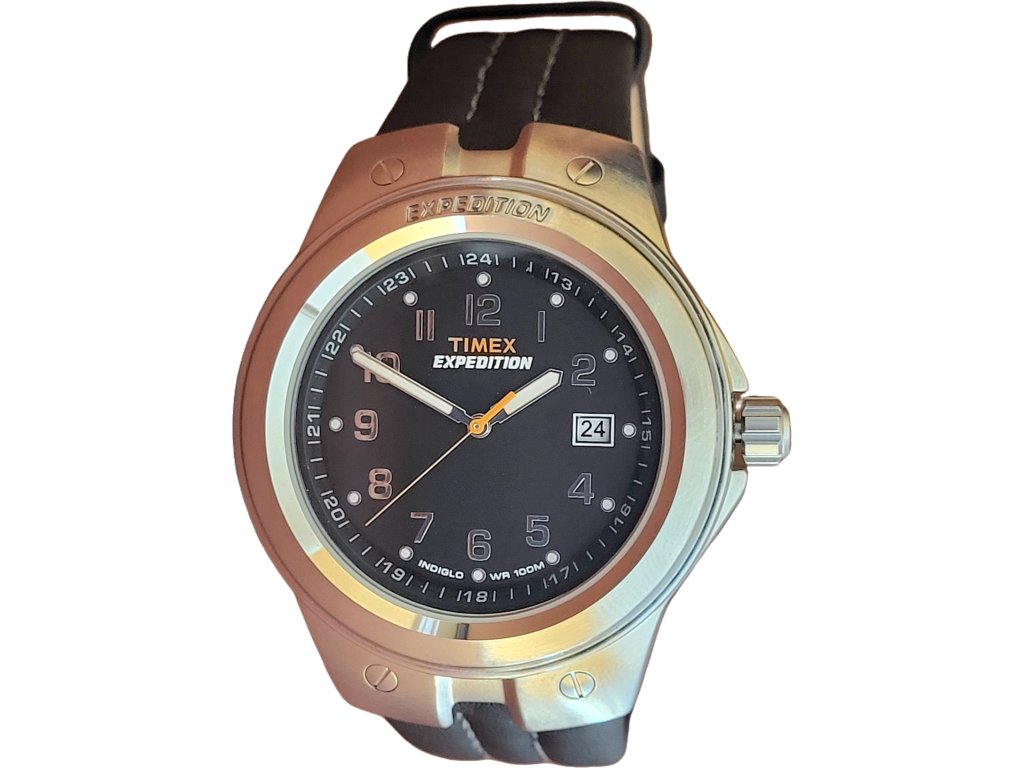 Outdoorové hodinky s podsvícením Indiglo. Zobrazují aktuální den v měsíci, luminiscenční ručičky. Voděodolnost 100 m.