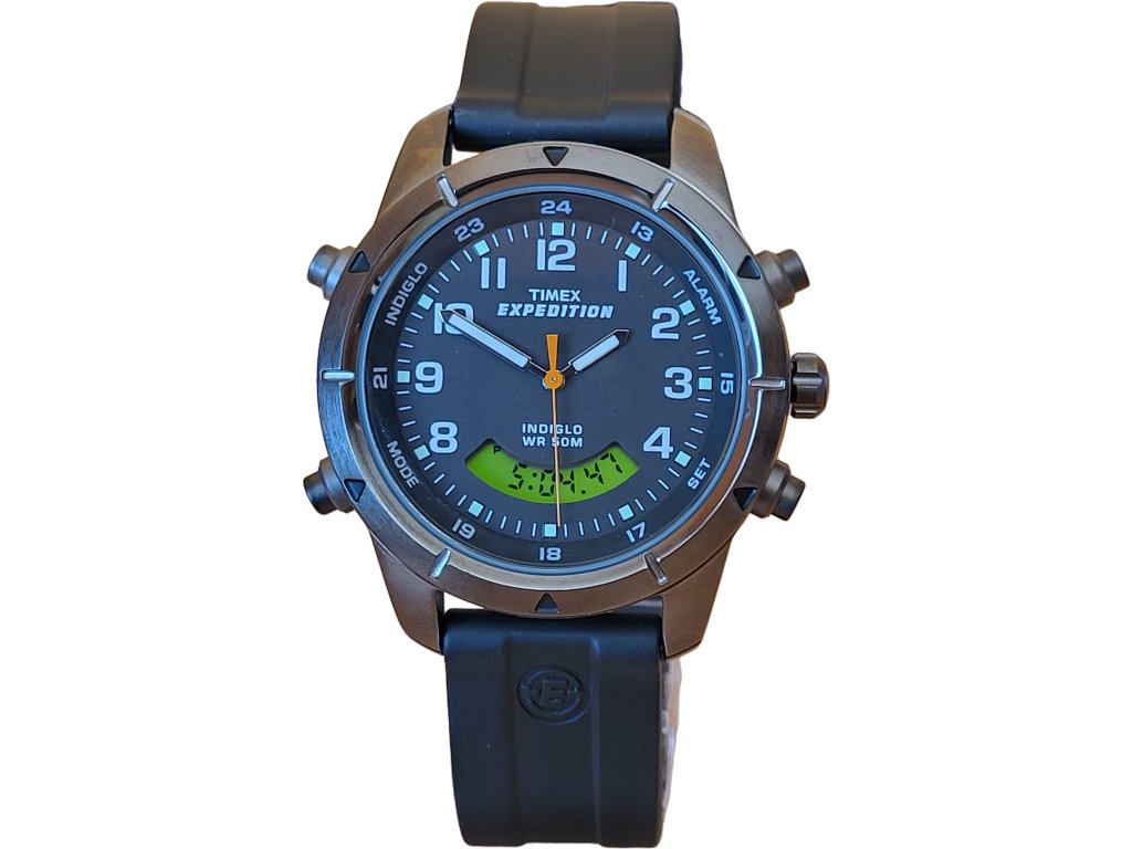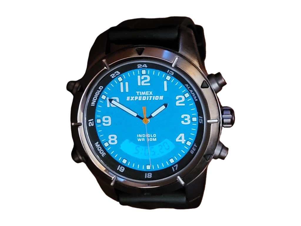 Outdoorové hodinky chronografem, odpočítávačem a budíkem, kombinace digitálního a analogového času, datum, Indiglo, noční režim, pevná luneta, luminiscenční ručičky i ciferník, voděodolnost 50 m