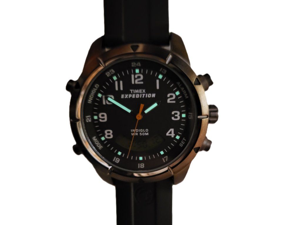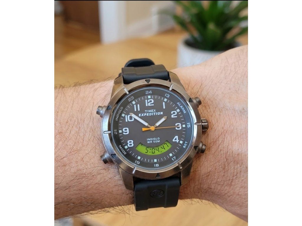 Odolné pánské hodinky Timex T49826 Expedition kombinují analogový a digitální čas. Nabízí chronograf, budík, vodotěsnost 50m a unikátní noční podsvícení Indiglo. Ideální parťák pro každé dobrodružství.