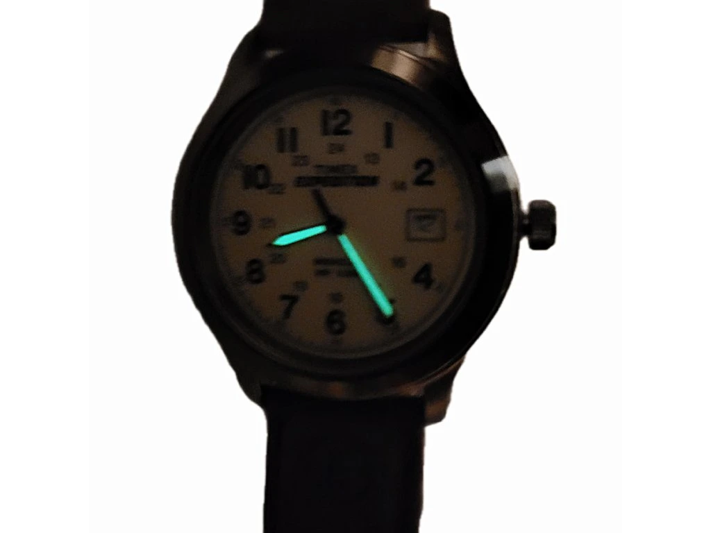 Luminiscenční ručičky: Ručičky jsou opatřeny vrstvou, která po nasvícení světlem sama září, což usnadňuje rychlou orientaci v šeru bez nutnosti aktivovat Indiglo.