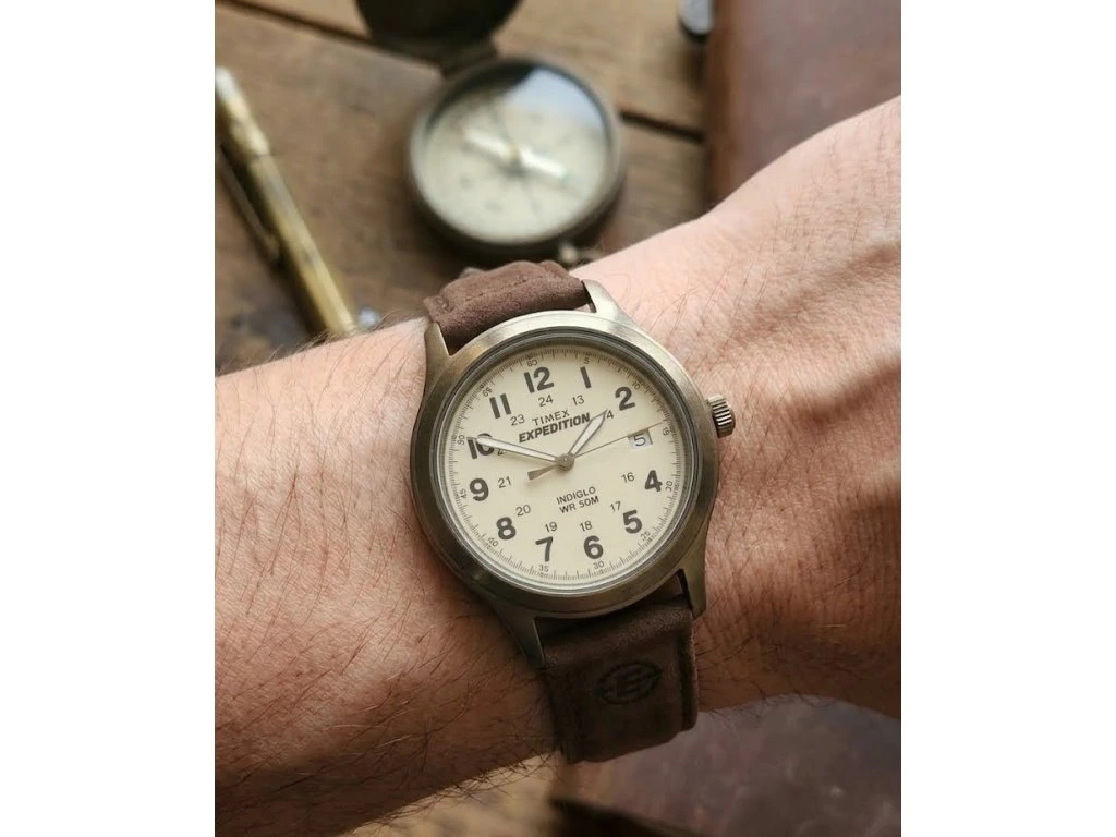 Komfortní řemínek: Prošívaný voděodolný kožený řemínek s logem Expedition, který je pohodlný i při dlouhém nošení v terénu.