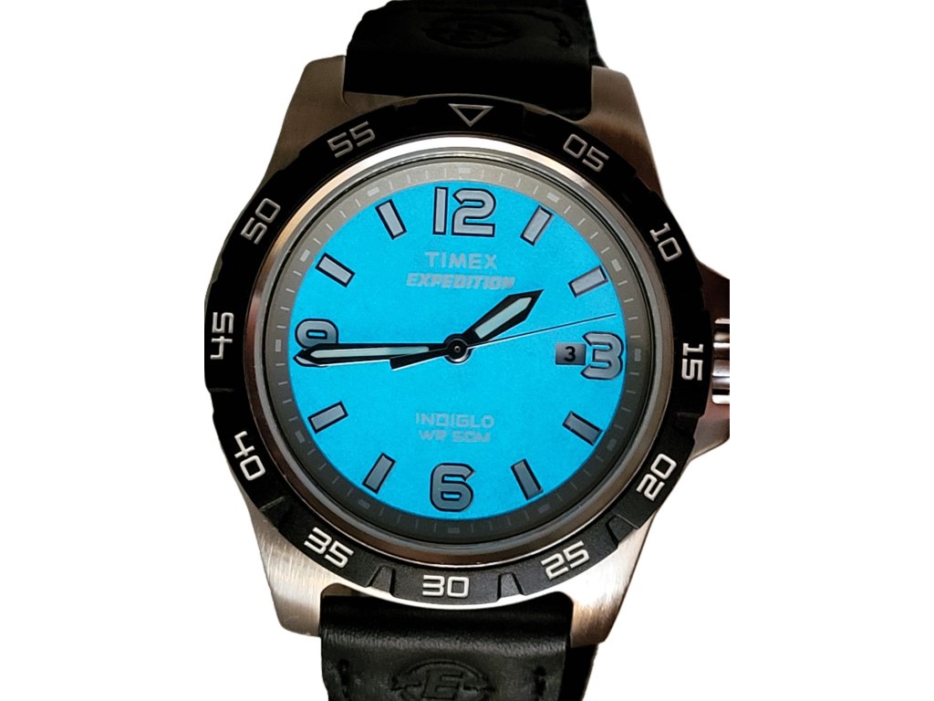Outdoorové hodinky s pevnou lunetou, zobrazují aktuální den v měsíci, Indiglo, luminiscenční ručičky, voděodolnost 50 m