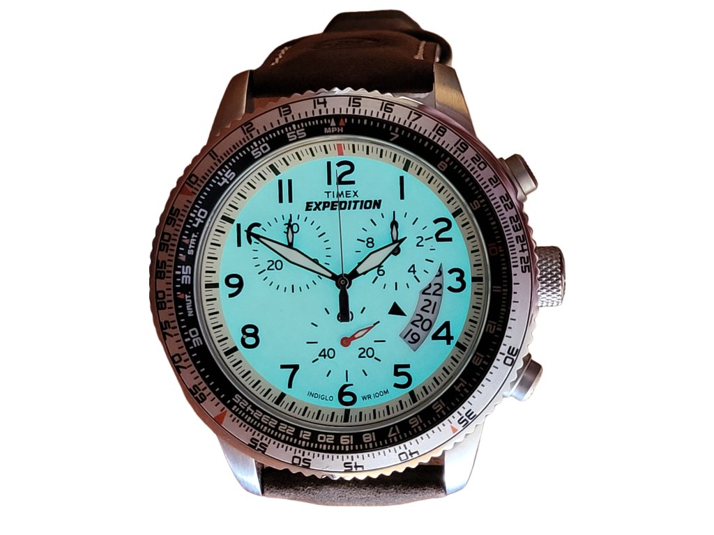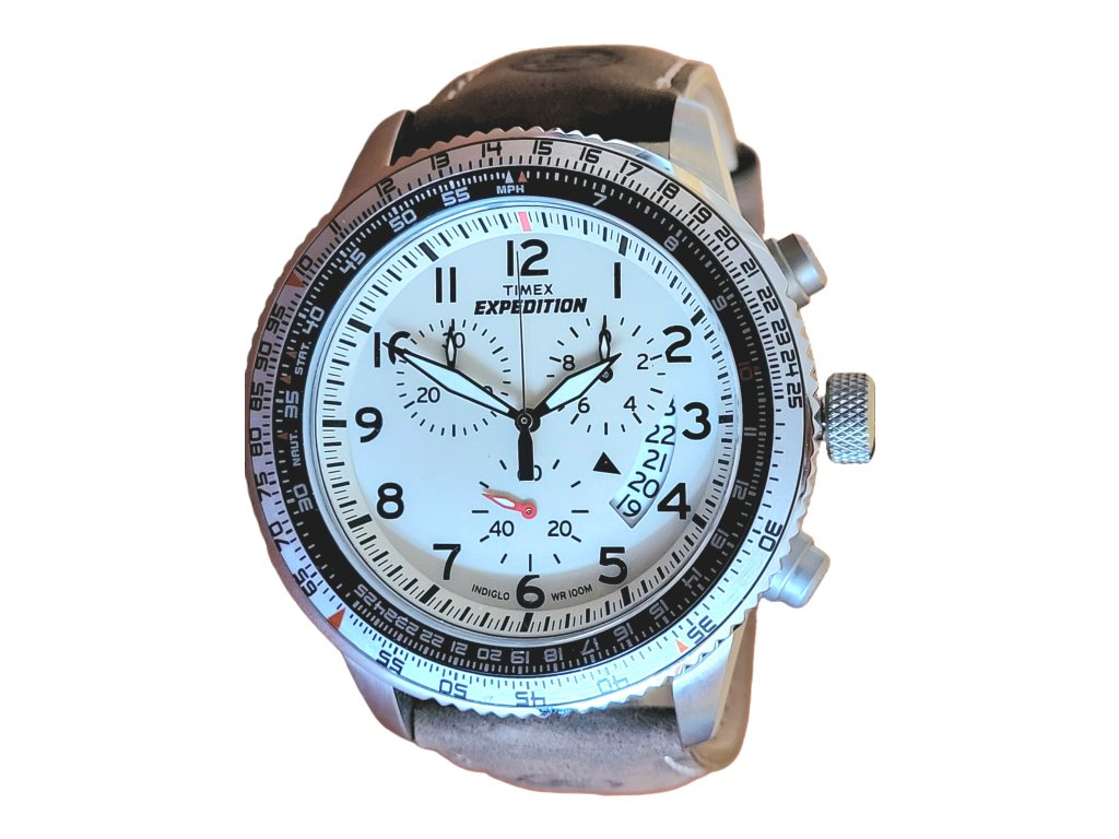 Outdoorové hodinky s chronografem, datum zobrazuje aktuální den v měsíci, obousměrně otočná luneta, luminiscenční ručičky, vodotěsnost 100 m, podsvícení Indiglo s nočním režimem