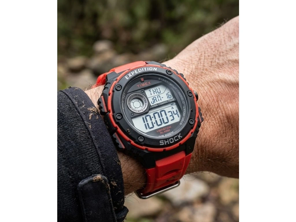 Extrémně odolné hodinky Timex Expedition T49984 SHOCK. Vodotěsnost 200 m, vibrační alarm a unikátní hydratační režim. Ideální parťák i do drsného terénu.