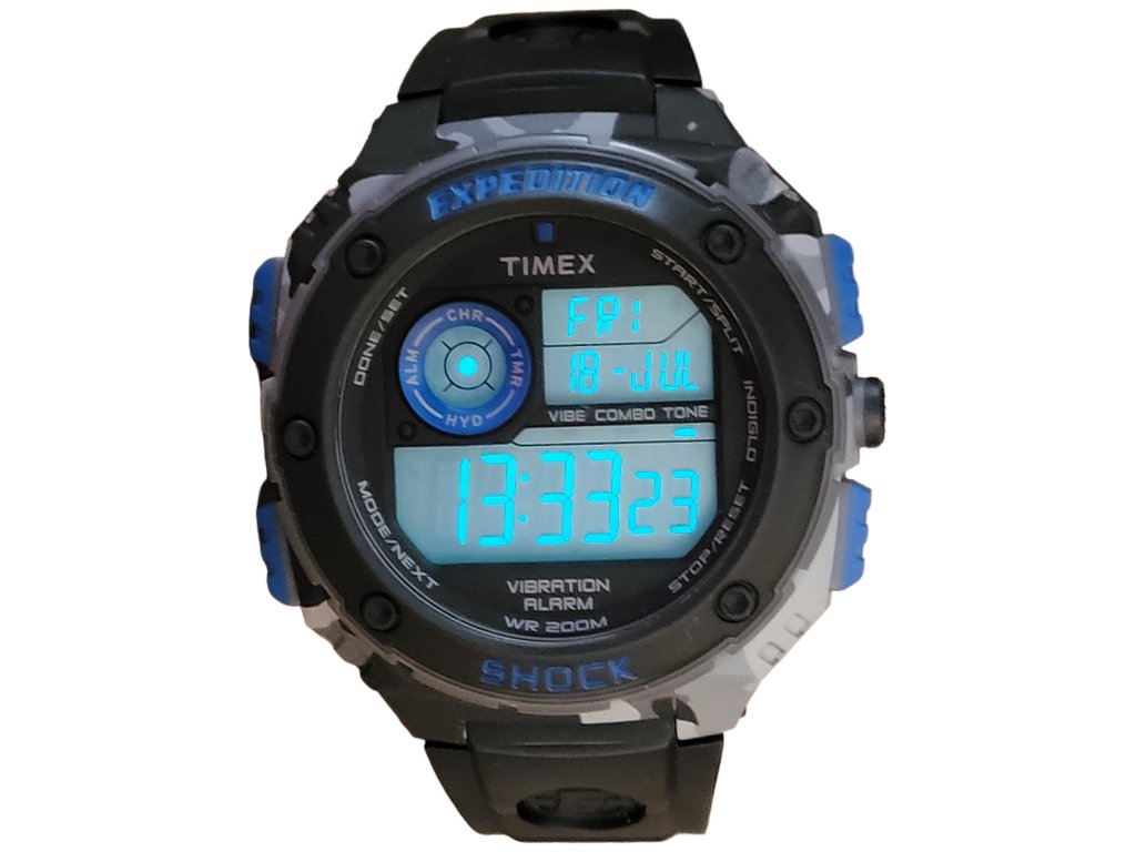 Outdoorové hodinky s chronografem, odpočítávač, 3 budíky, možnost nastavit si upozornění na dodržení pitného režimu, odolné vůči nárazům, vibrační upozornění, vodotěsnost 200 m, podsvícení Indiglo