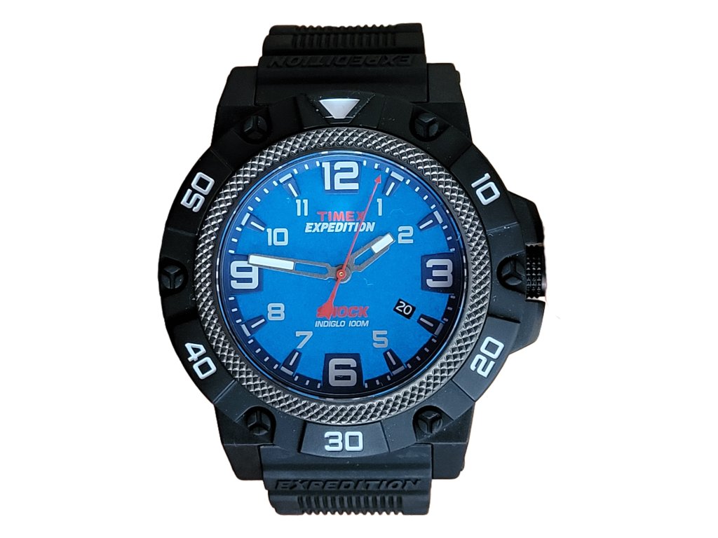 Outdoorové hodinky s osvětlením Indiglo, zobrazují aktuální den v měsíci, luminiscenční ručičky, pevná luneta, voděodolnost 100 m, odolné vůči nárazům