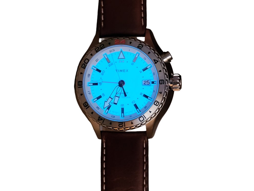 Klasické hodinky s podsvícením Indiglo, datum zobrazuje aktuální den v měsíci, luminiscenční ručičky, vovotěsnost 100 m, jednosměrně otočná luneta a pomocná ručička pro odečet jiného časového pásma