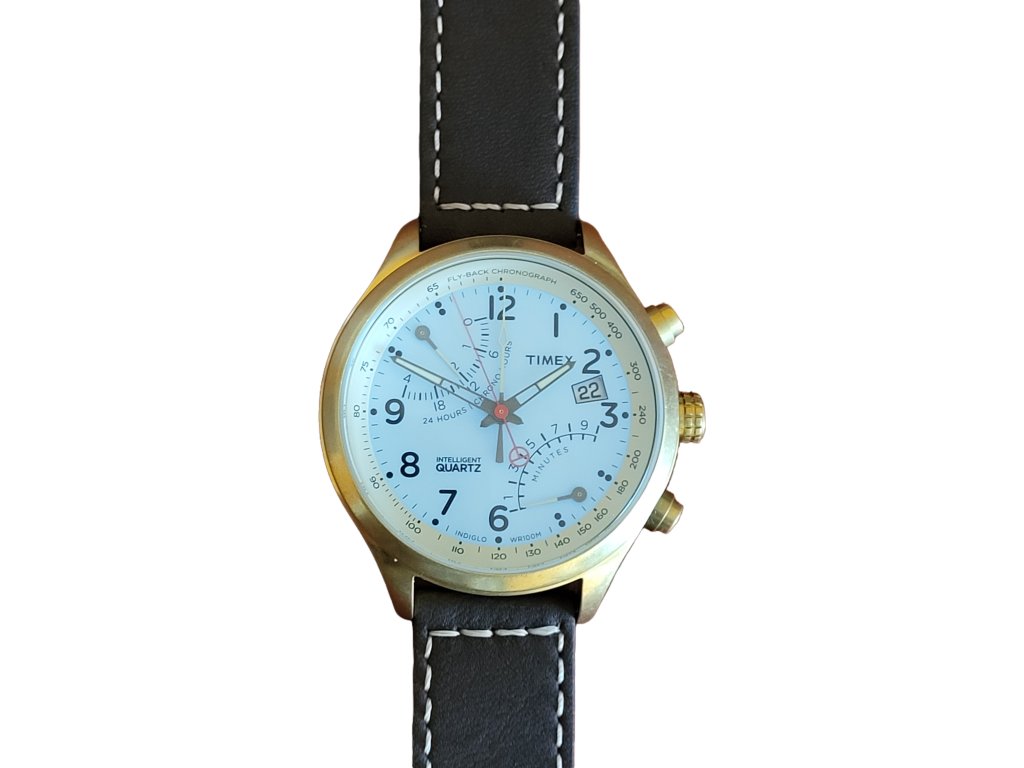 Klasické hodinky s podsvícením, datum zobrazuje aktuální den v měsíci, dva doplňkové displeje 10 minut a 24 hodin, luminiscenční ručičky, vodotěsnost 100 m, chronograf, tachymetrická stupnice umistěna na okraji ciferníku