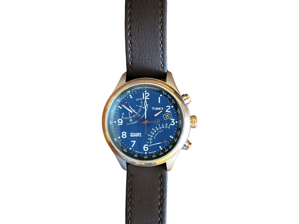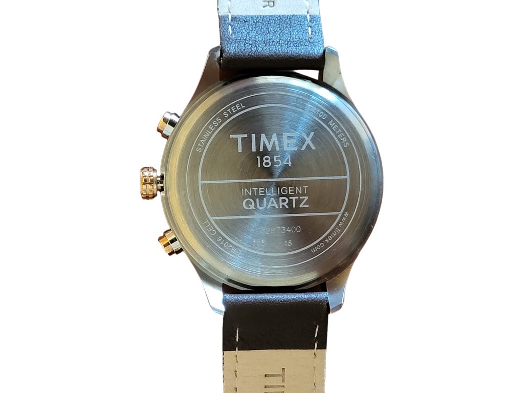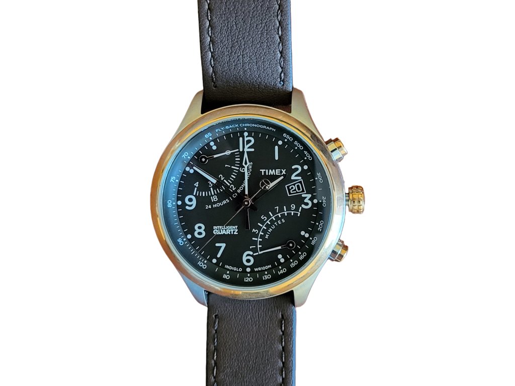 Klasické hodinky s podsvícením, datum zobrazuje aktuální den v měsíci, dva doplňkové displeje 10 minut a 24 hodin, luminiscenční ručičky, vodotěsnost 100 m, chronograf, tachymetrická stupnice umistěna na okraji ciferníku