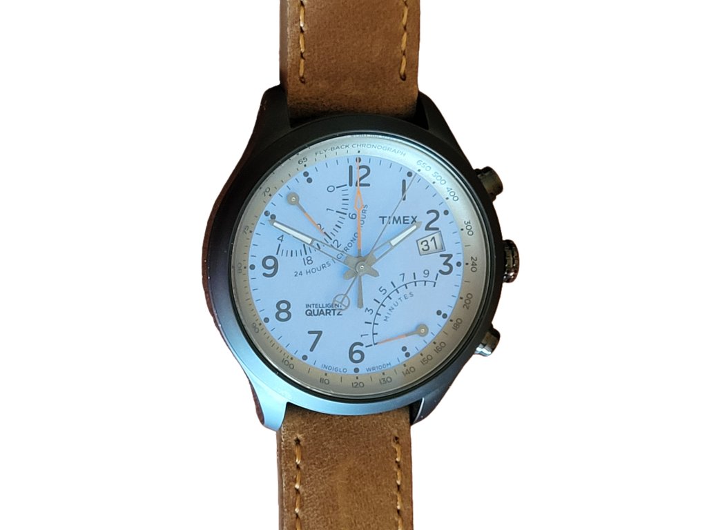Klasické hodinky s podsvícením, datum zobrazuje aktuální den v měsíci, dva doplňkové displeje 10 minut a 24 hodin, luminiscenční ručičky, vodotěsnost 100 m, chronograf, tachymetrická stupnice umistěna na okraji ciferníku