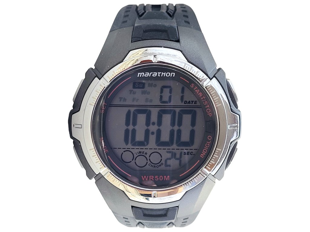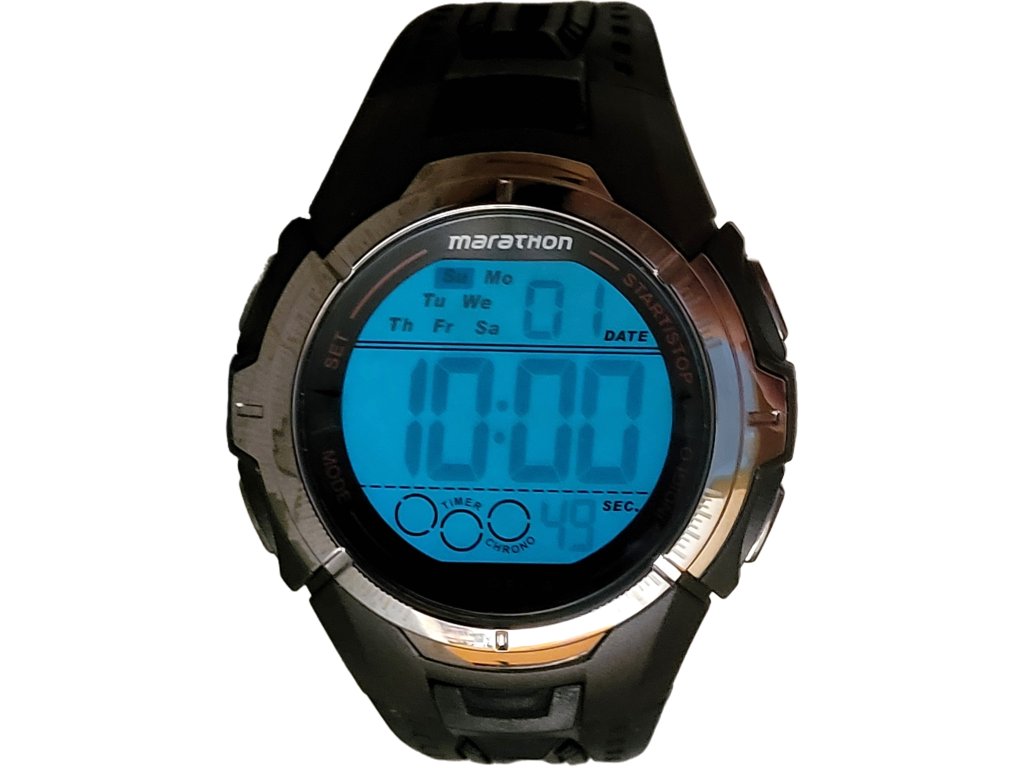Sportovní hodinky s chronografem, odpočítávačem a budíkem. Podsvícení Indiglo. Datum se zobrazuje jako zkratka dne v týdnu a aktuální den. Voděodolnost 50 m