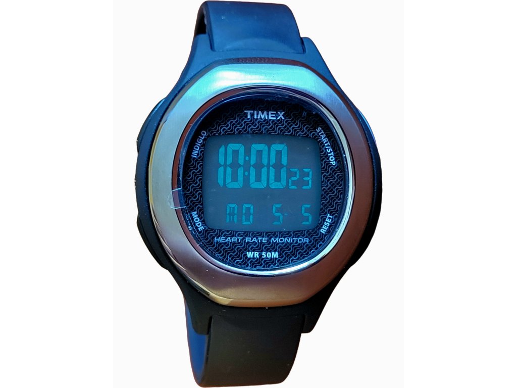 Sportovní hodinky s chronografem a odpočítávačem, noční světlo Indiglo, voděodolnost 50 m, budík, poskytuje údaje o tepové frekvenci bez hrudního pásu, sleduje spálené kalorie, upozorní na cílovou zónu