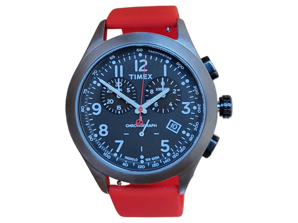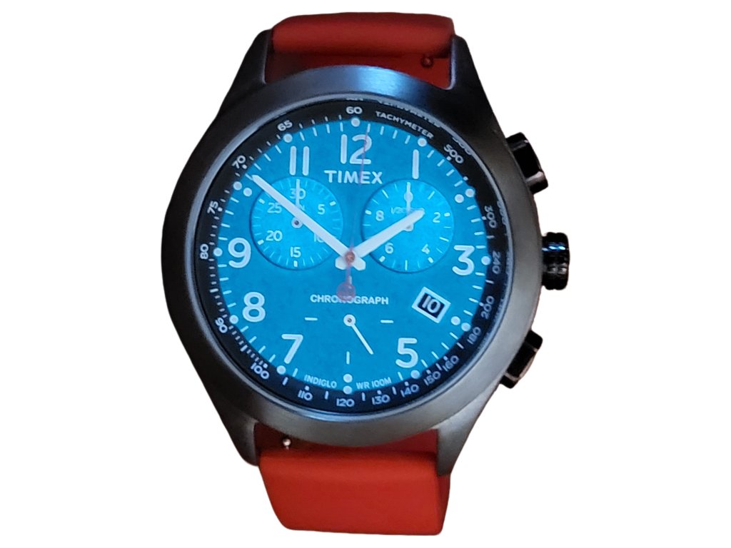 Sportovní hodinky s chronografem, datum zobrazuje aktuální den v měsíci, tachymetrická stupnice po obvodu ciferníku, podvícení Indiglo s nočním režimem, vodotěsnost 100 m