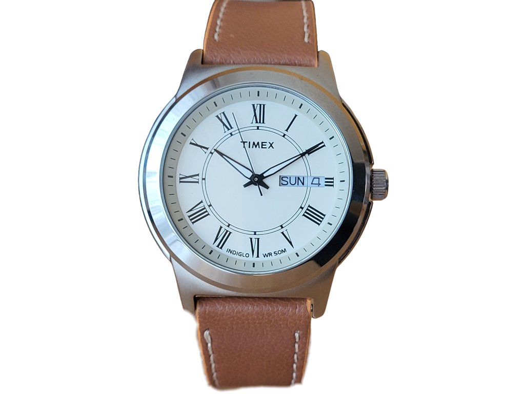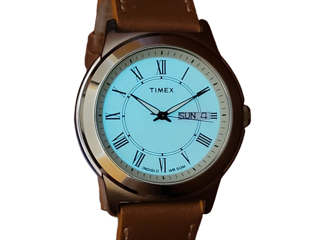 Klasické hodinky s podsvícením Indiglo, datum zobrazuje aktuální den v měsíci, voděodolnost 50 m, luminiscenční ručičky