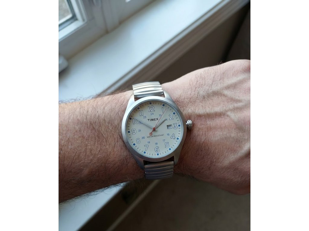 Voděodolné ocelové hodinky Timex T2N309 s podsvícením Indiglo a krémovým ciferníkem, datumem, a ocelovým tahem. Ideální do práce i na volný čas.