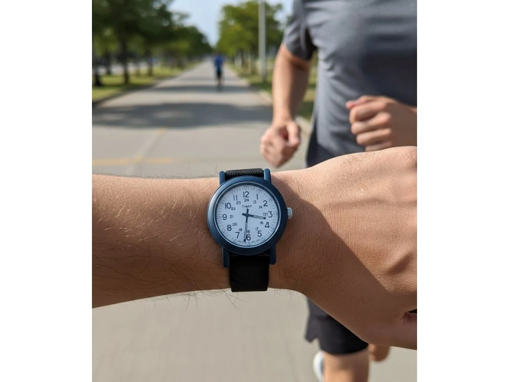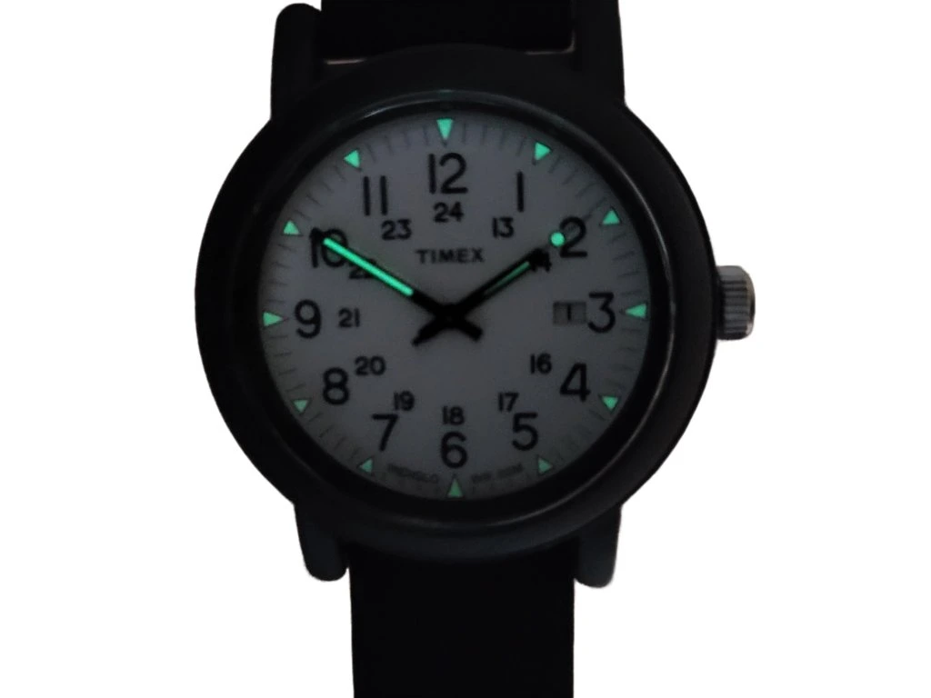 Voděodolné hodinky Timex T2N325W s podsvícením Indiglo, luminiscencí a datumem. Černý silikonový řemínek s quick release systémem. Praktický pomocník v tmavě modrém pouzdře.