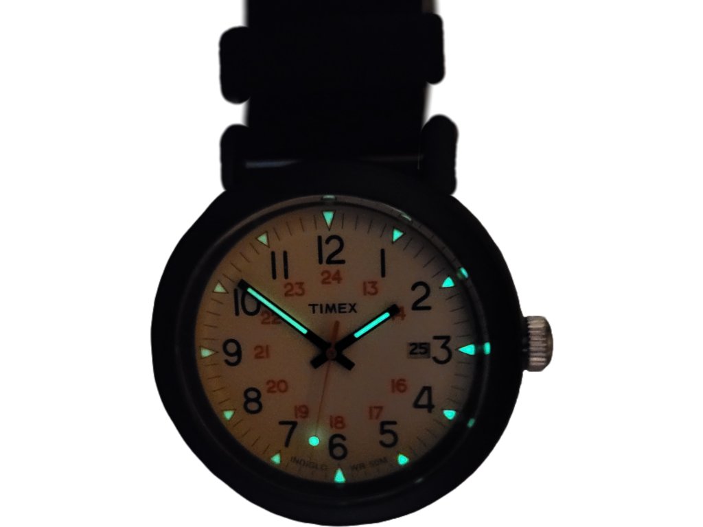 Klasické hodinky s podsvícením Indiglo, datum zobrazuje aktuální den v měsíci, voděodolnost 50 m, luminiscenční ručičky a indexy čísel
