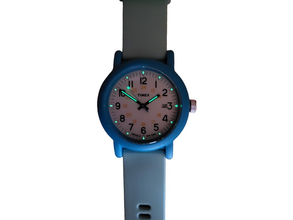 Klasické hodinky s podsvícením Indiglo, datum zobrazuje aktuální den v měsíci, voděodolnost 50 m, luminiscenční ručičky a indexy čísel