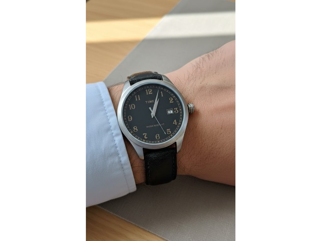 Timex T2N406 v moderním černém provedení. Černý ciferník s hřejivými detaily, 38mm ocelové pouzdro a kvalitní černá kůže. Hodí se k džínám i saku.
