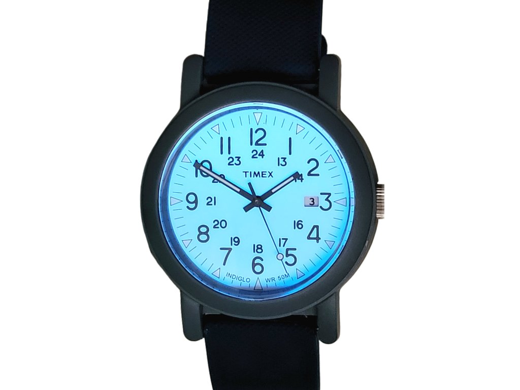 Klasické hodinky s podsvícením Indiglo, datum zobrazuje aktuální den v měsíci, voděodolonost 50 m, luminiscenční ručičky