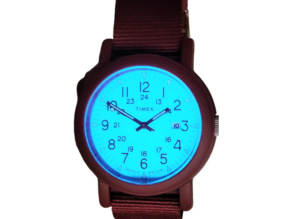 Klasické hodinky s podsvícením Indiglo, datum zobrazuje aktuální den v měsíci, voděodolonost 50 m, luminiscenční ručičky