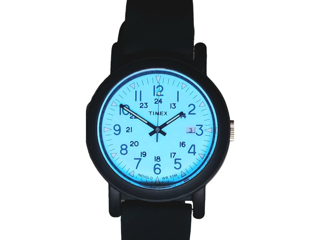 Klasické hodinky s podsvícením Indiglo, datum zobrazuje aktuální den v měsíci, voděodolonost 50 m, luminiscenční ručičky