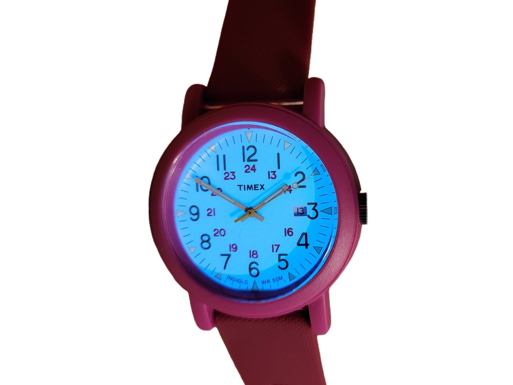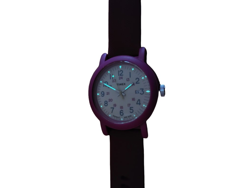 Klasické hodinky s podsvícením Indiglo, datum zobrazuje aktuální den v měsíci, voděodolnost 50 m, luminiscenční ručičky a indexy čísel
