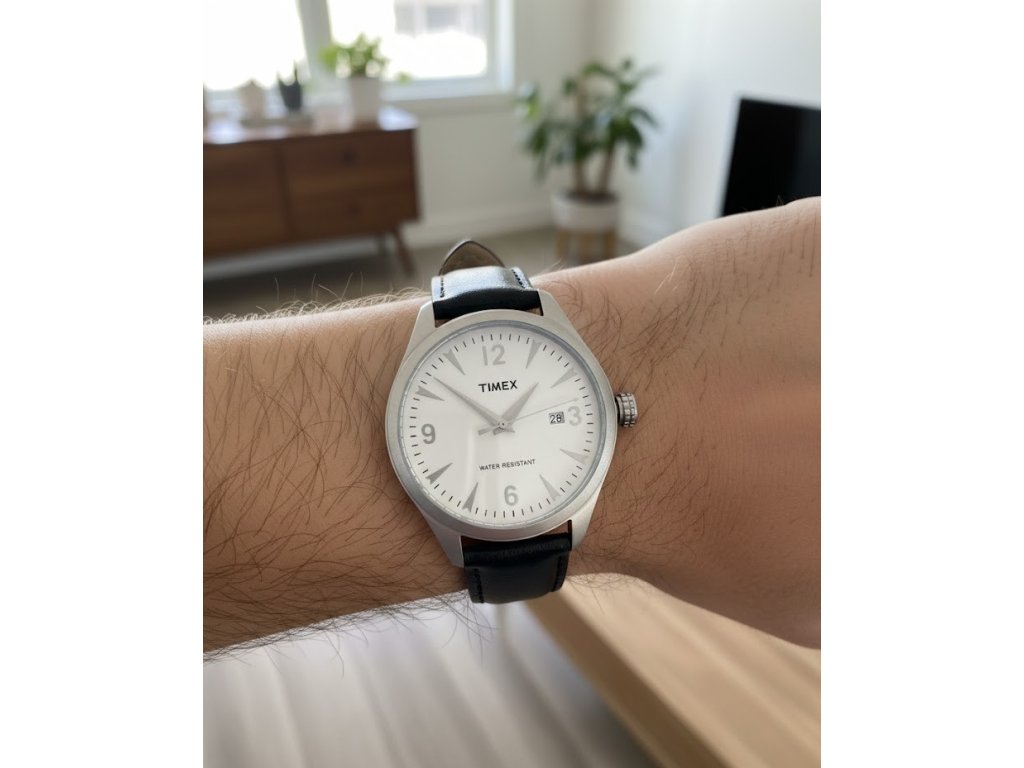 - Řemínek: Kožený řemínek Timex s trnovou sponou, šíře 20 mm.