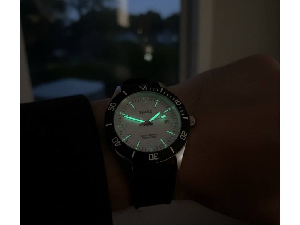 Čitelnost: Vysoký kontrast číselníku a výrazné indexy, pouzdro lemuje pevná výrazná luneta, která celý vizuální dojem sjednocuje.