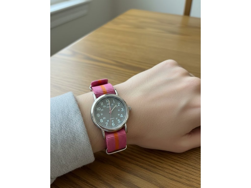 Hodinky Timex T2N834 s ikonickým podsvícením Indiglo. Průměr 30 mm, růžový NATO řemínek a šedý ciferník. Univerzální drobný doplňek, který na ruce téměř neucítíte.