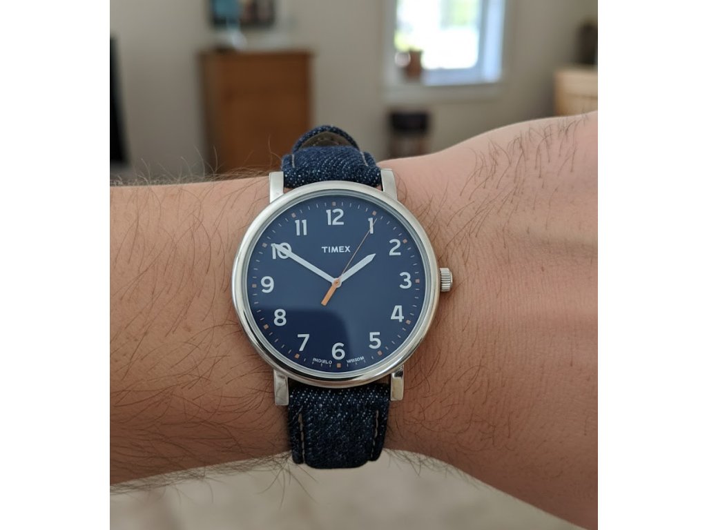 Timex T2N955 42mm pouzdro, modrý ciferník a patentované podsvícení Indiglo. Velký ciferník a denim look, který vždy upoutá pozornost.