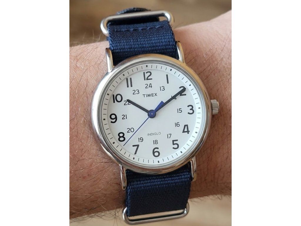 Klasické hodinky Timex Weekender T2P143W s 38mm pouzdrem a ikonickým podsvícením Indiglo. Spolehlivý 24hodinový ciferník a pohodlný nylonový řemínek pro každý den.