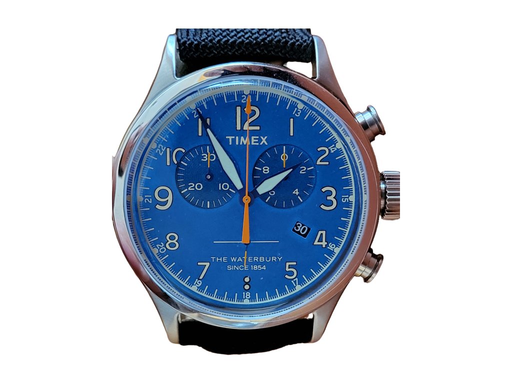 Klasické hodinky s podsvícením Indiglo, datum zobrazuje aktuální den v měsíci, chronograf, vodotěsnost 50 m, luminiscenční ručičky