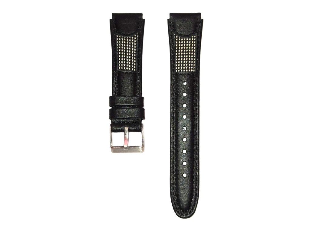 Černý kožený řemínek se silonem a ocelovou sponou.