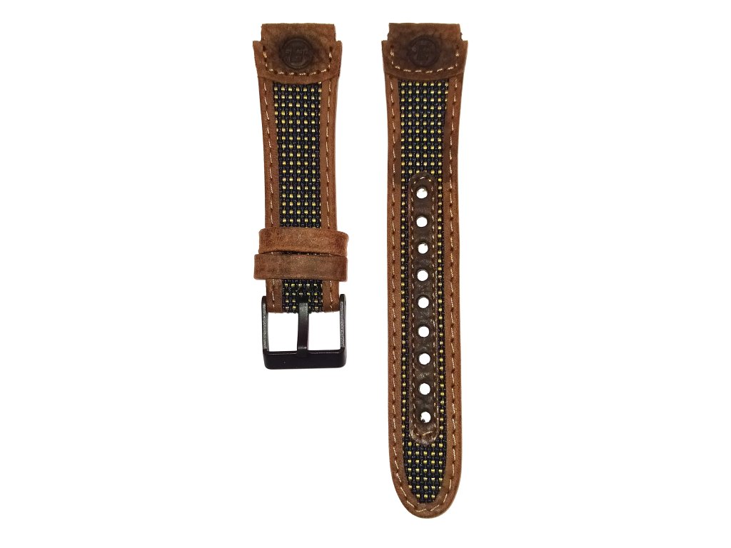 Hnědo černý kožený řemínek se silonem a ocelovou sponou.