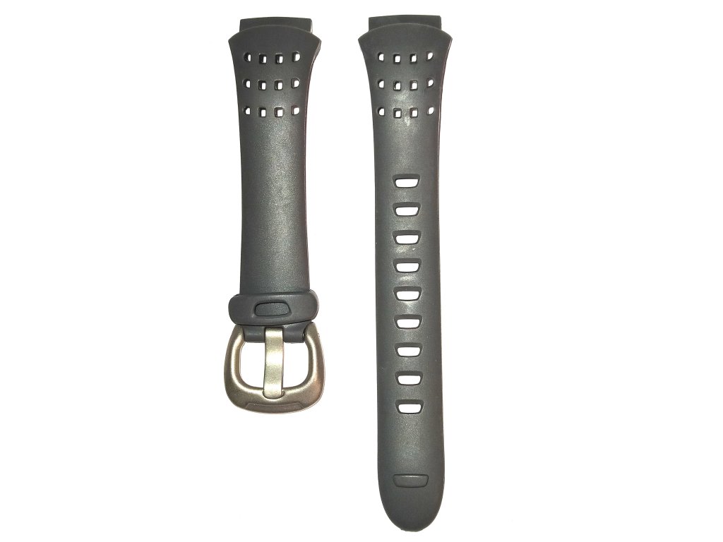 Šedivý řemínek s ocelovou sponou.