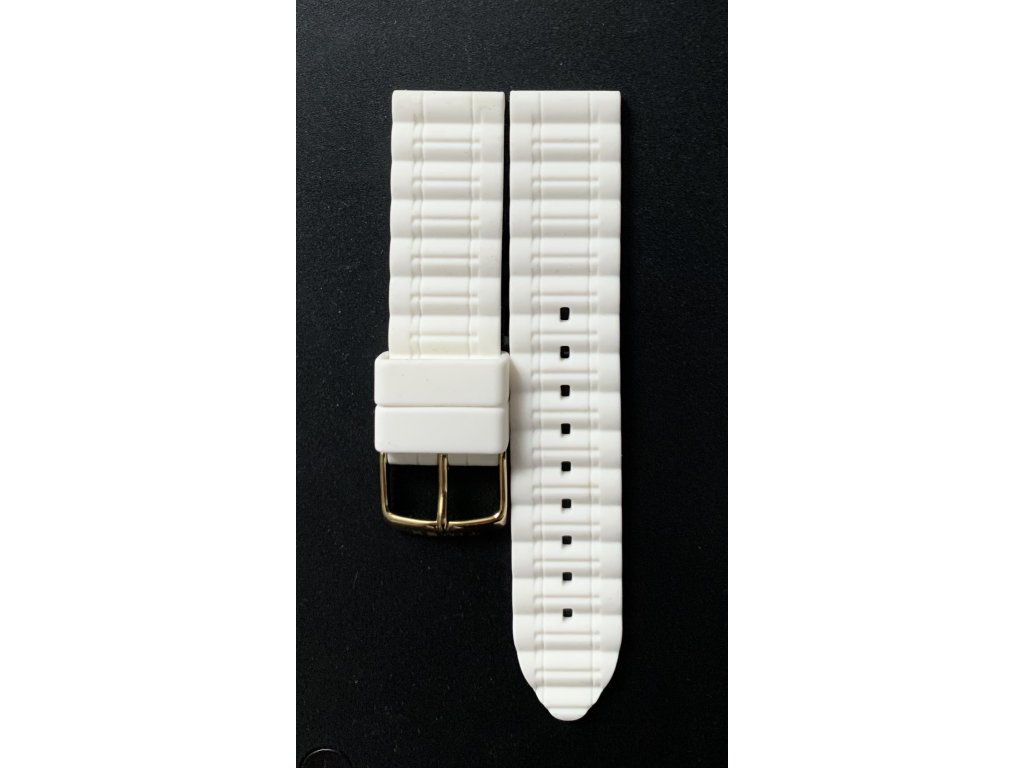Řemínek na hodinky od firmy Timex. Materiál řemínku- gumový,bílý,voděodolný,zlatá kovová spona,uchycení standart (bez záruky na zabarvení)