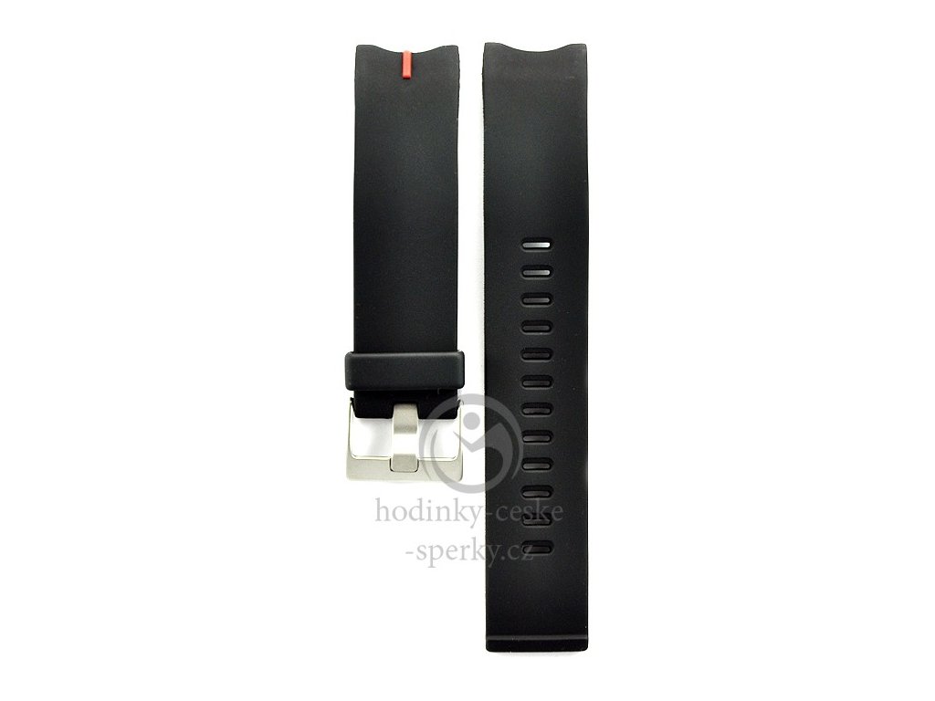 Řemínek s šířkou 22mm. Je černý s červenou čárkou a stříbrnou ocelovou sponou. Patří na model hodinek T49211 a T2P285.